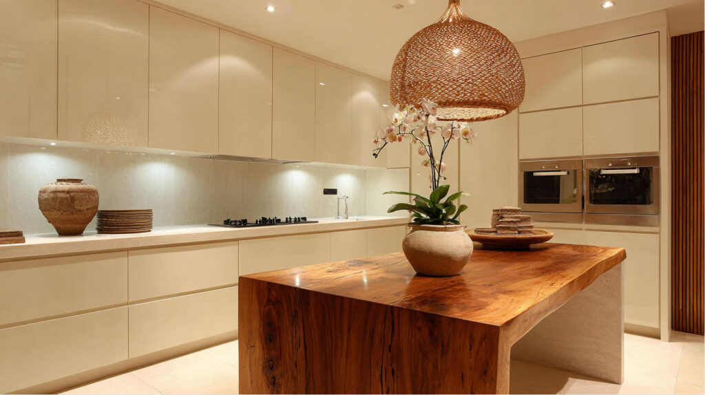 6.Cream Cabinets with Tropical Wood Accents