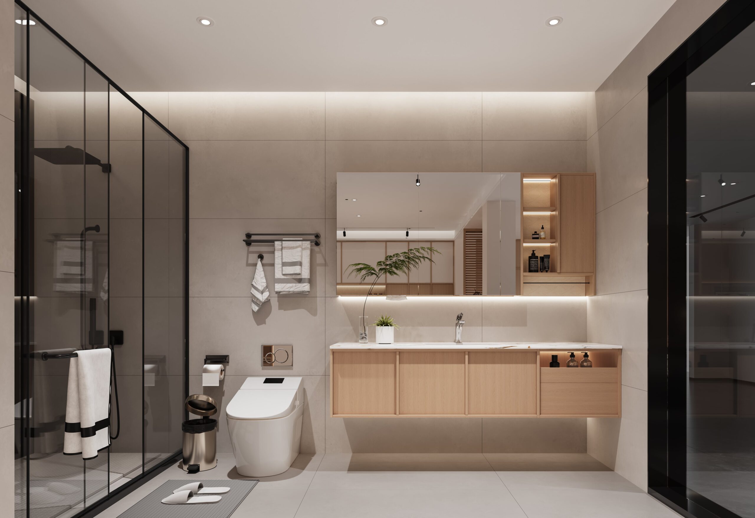 Sambut minimalis dengan meja rias kamar mandi modern, yang ditandai dengan garis-garis bersih dan perangkat keras tersembunyi. Material seperti kayu dan logam sering kali membingkai meja rias ini, sementara meja kaca atau kuarsa menambahkan sentuhan kecanggihan.