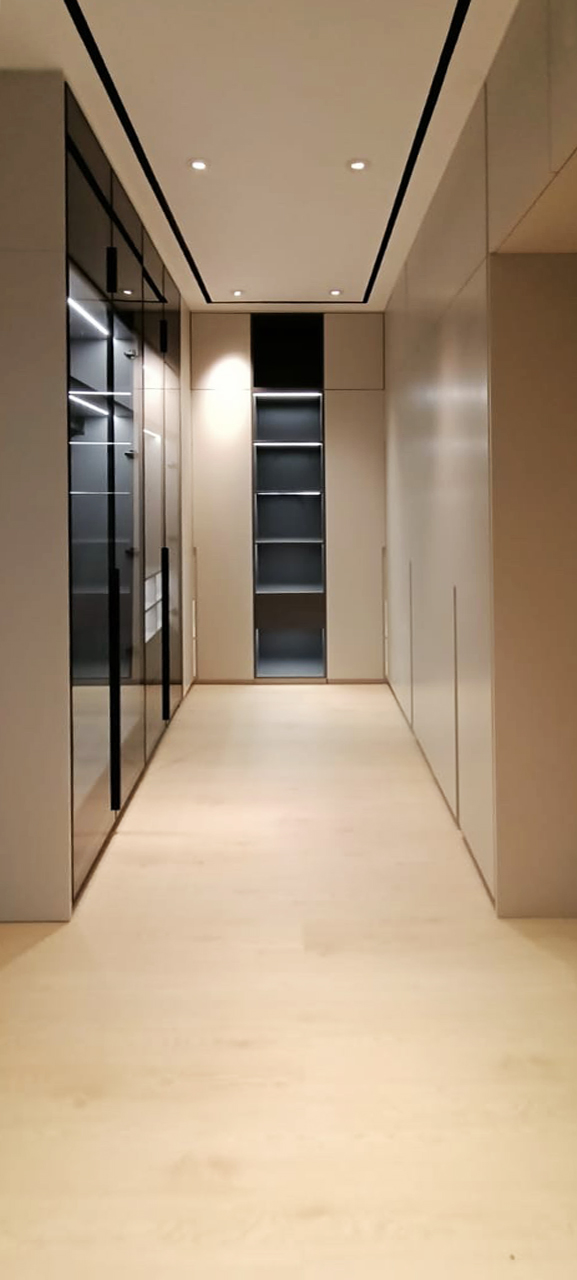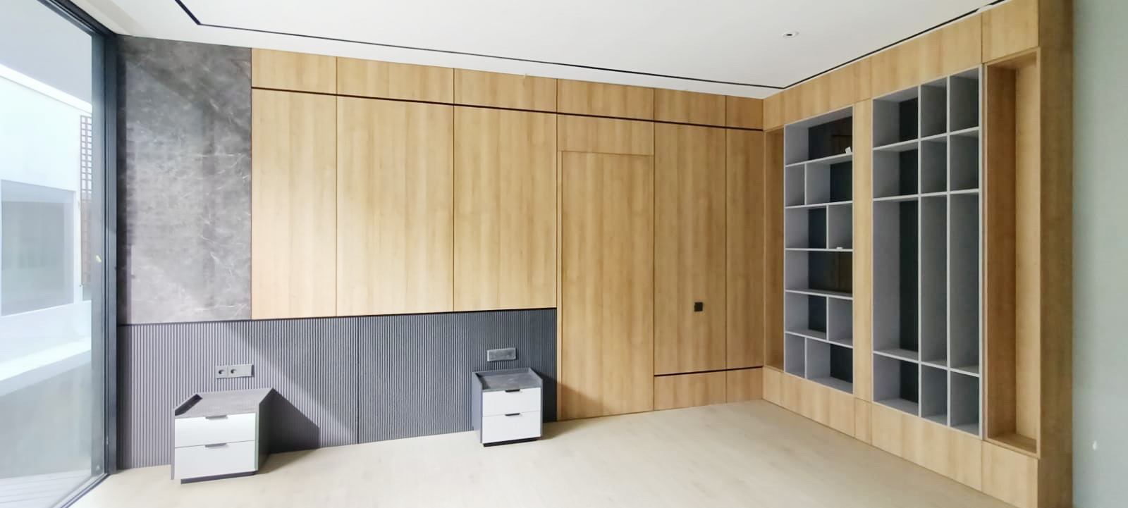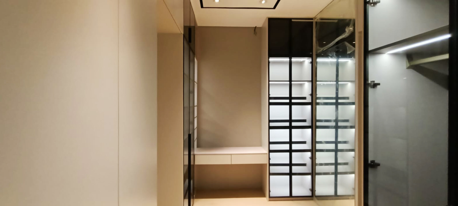This Indonesian project features a beautifully designed TV cabinet,  and a luxurious walk-in closet, all incorporating modern elements and efficient storage solutions. The TV cabinet offers a sleek, minimalist design, complementing the contemporary living space. The walk-in closet boasts high-end organizational features, maximizing both style and functionality.  Each area has been carefully crafted to combine elegance with practicality, offering a sophisticated touch to the home.