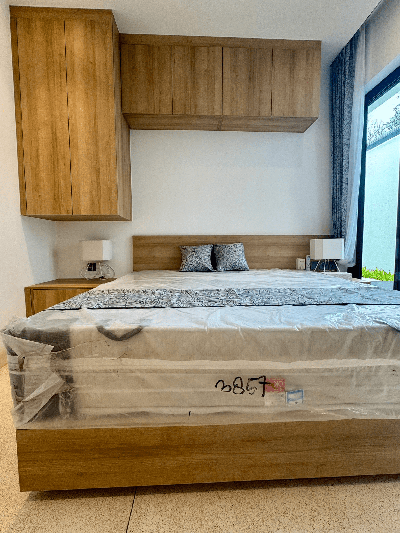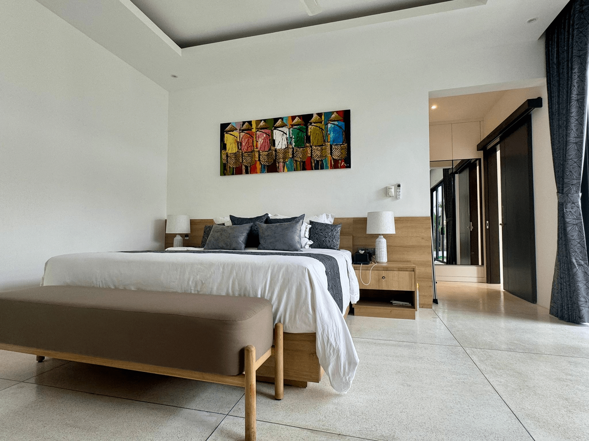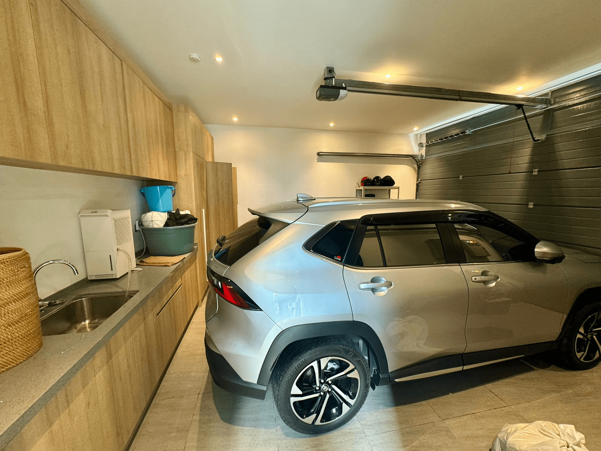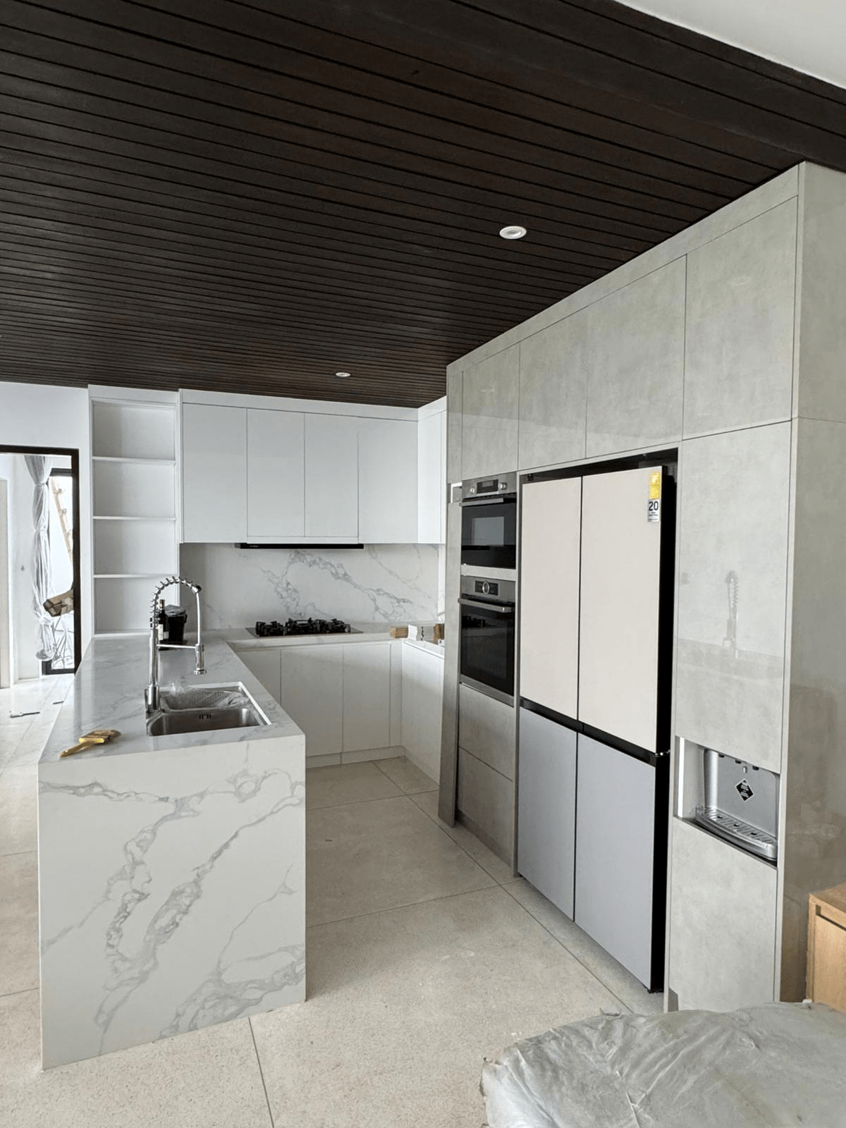 This Bali project showcases a blend of modern design and custom craftsmanship throughout the home. The kitchen features a stunning white kitchen island, providing a stylish focal point for cooking and entertaining. The seamless integration of natural light into the open-plan space highlights the custom garage cabinet for functional storage, keeping the garage organized while adding aesthetic appeal. In the bedrooms, custom nightstands offer a personalized touch to each room’s decor, pairing with minimalist wooden furniture to create a calm, serene atmosphere. Elements of Balinese style cabinet design are subtly incorporated, adding a local aesthetic that complements the modern interior. From the living room to the kitchen and bedroom, every detail in this Bali home reflects high-quality design and custom solutions—including Balinese style cabinets—that cater to both functionality and style.