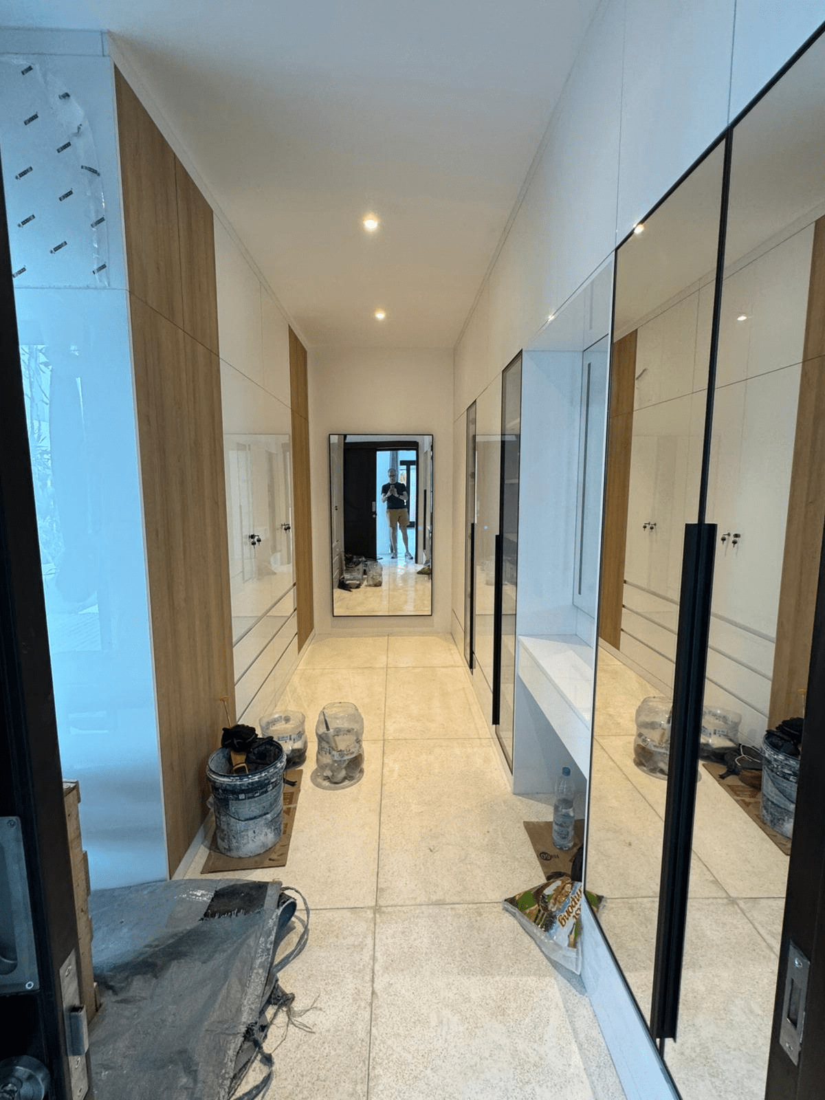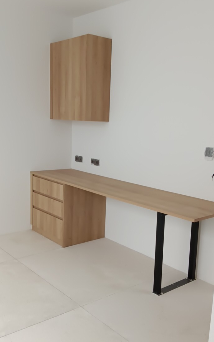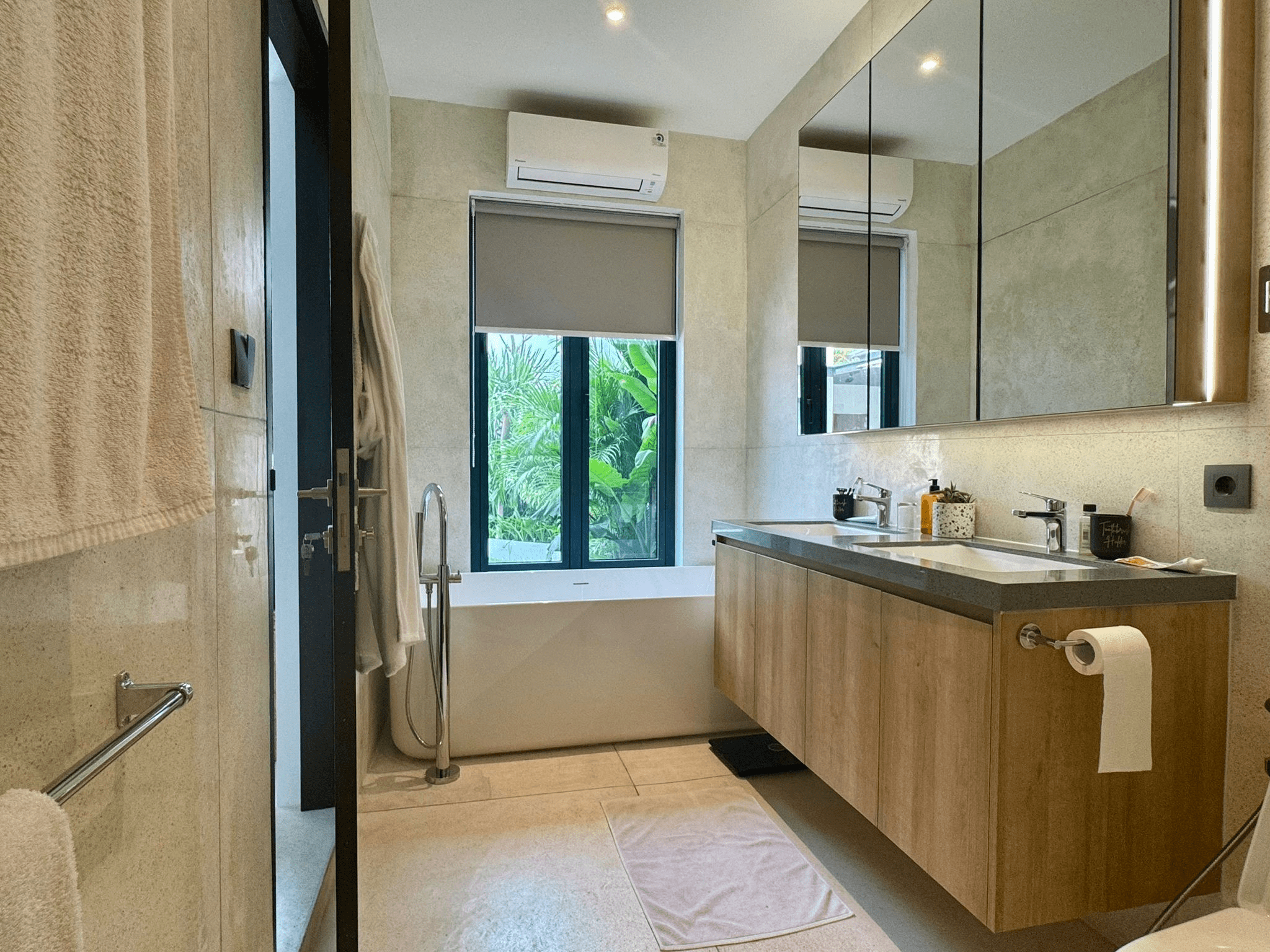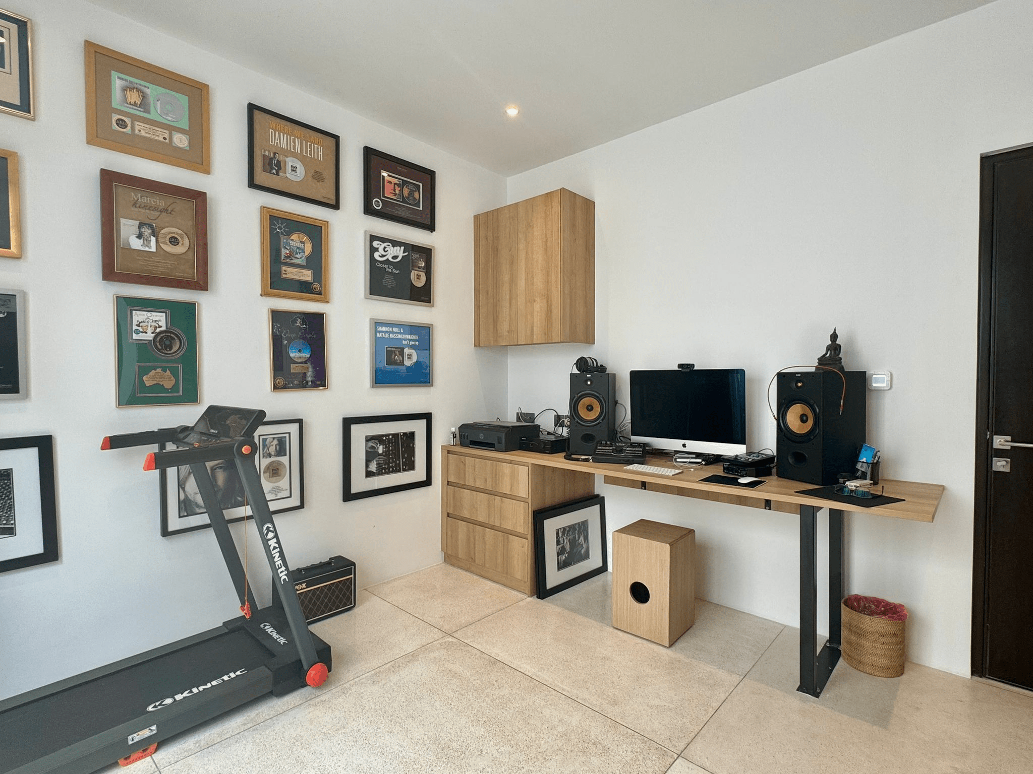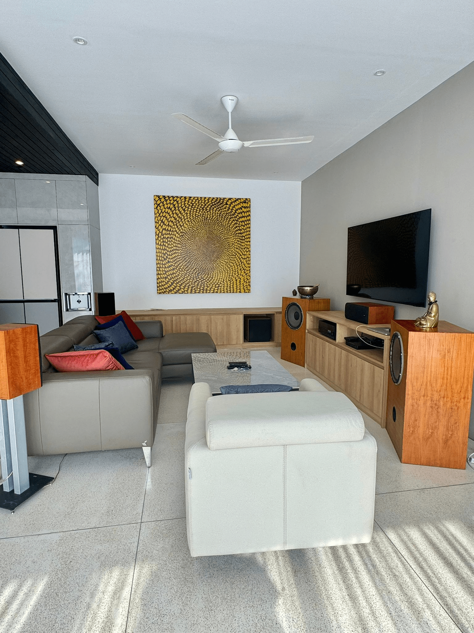 This Bali project showcases a blend of modern design and custom craftsmanship throughout the home. The kitchen features a stunning white kitchen island, providing a stylish focal point for cooking and entertaining. The seamless integration of natural light into the open-plan space highlights the custom garage cabinet for functional storage, keeping the garage organized while adding aesthetic appeal. In the bedrooms, custom nightstands offer a personalized touch to each room’s decor, pairing with minimalist wooden furniture to create a calm, serene atmosphere. Elements of Balinese style cabinet design are subtly incorporated, adding a local aesthetic that complements the modern interior. From the living room to the kitchen and bedroom, every detail in this Bali home reflects high-quality design and custom solutions—including Balinese style cabinets—that cater to both functionality and style.