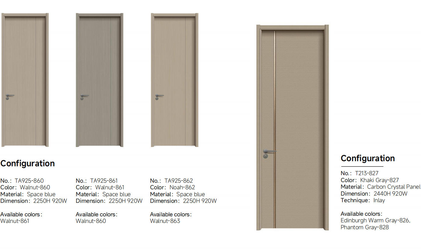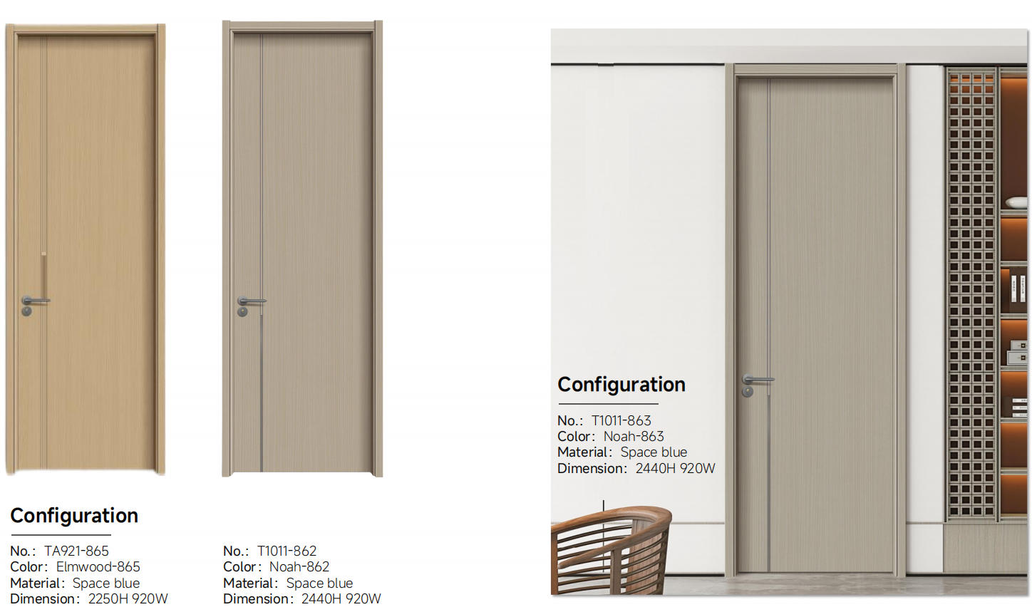 Standard examples include 2250 × 920 mm and 2440 × 920 mm; other heights and widths can be custom made. Typical thickness 43 mm . Coordinate with matching wall panels, skirting, and cabinetry for a seamless, minimalist scheme.