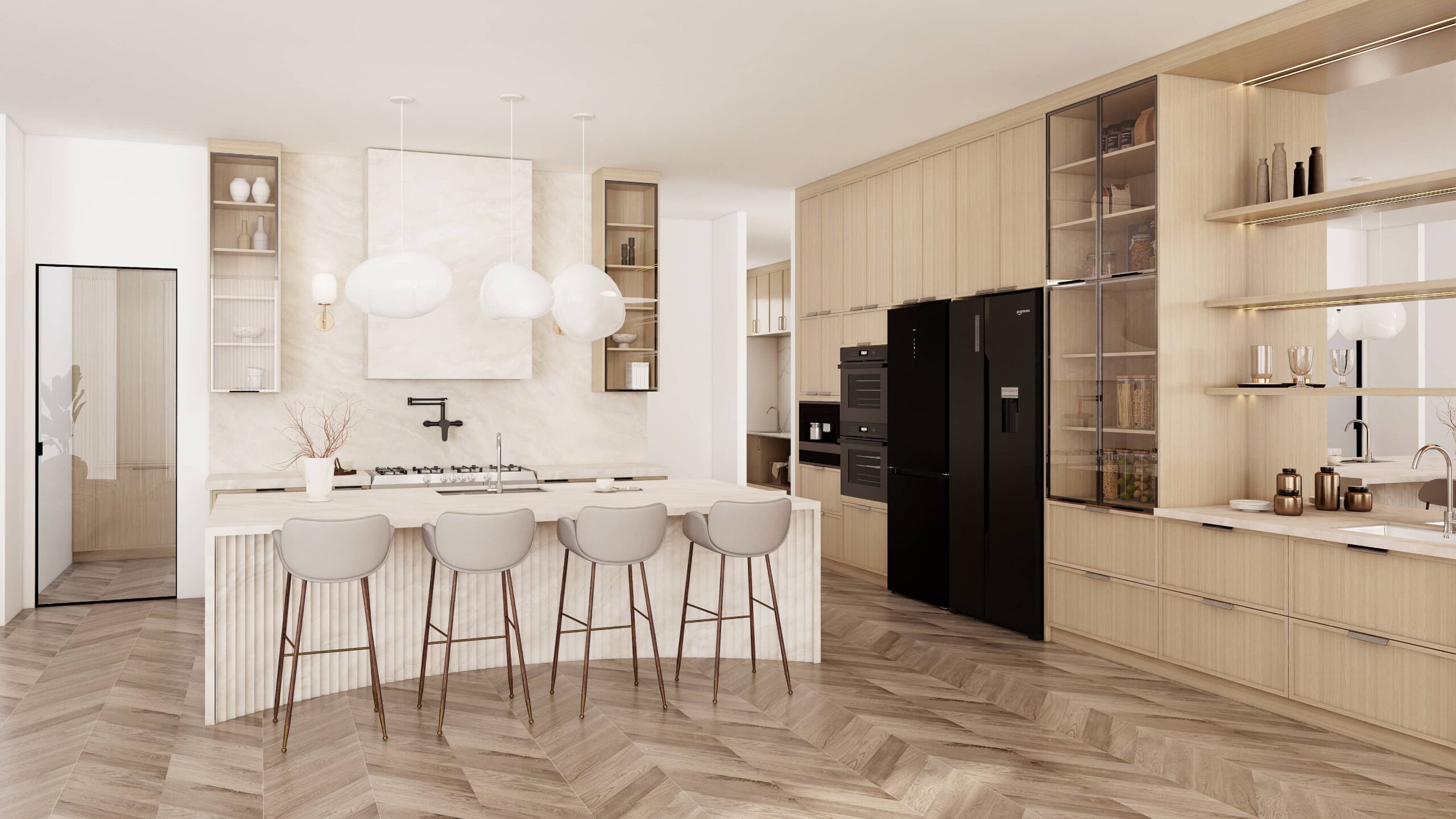 The ribbed island front adds texture and detail to a very clean kitchen design. Without it, the island could look too flat or plain. This kind of vertical texture gives the kitchen a more custom look and introduces subtle visual rhythm, especially when the rest of the cabinetry is smooth and minimal.